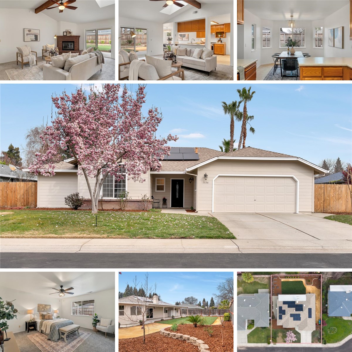 Welcome to 3134 Lake Mead Ct, located in the desirable Amber Grove community and perfectly situated on a quiet cul-de-sac. From the moment you arrive, you’ll appreciate the fantastic curb appeal, highlighted by a freshly painted exterior, well-manicured landscaping, and a stunning blooming Tulip tree that truly sets the tone. This move-in ready home offers a thoughtful and functional floor plan featuring 4 spacious bedrooms, 2 bathrooms, and 1,719 sqft of comfortable living space. The large great room is the heart of the home, showcasing a charming wood-beamed ceiling, skylight, and a beautiful brick fireplace, creating a warm and inviting atmosphere. The space flows seamlessly into the kitchen, which features an island with an eating bar and a cozy dining nook—perfect for everyday living and entertaining. Just off the kitchen is the laundry room with direct access to the 2-car garage. On the opposite side of the home, you’ll find three generously sized guest bedrooms with great closet space, a guest bathroom, and a spacious primary suite offering double closets and a private en-suite bathroom. Additional highlights include fresh interior paint, new closet doors, a whole house fan, and solar, adding comfort and efficiency. The backyard has recently been beautifully transformed and is ready to enjoy! Updates include brand new sod, decomposed granite walkways, new sprinklers, bark, and fresh flowers. There’s a large covered patio ideal for relaxing or entertaining, a designated garden area, and a side yard with decomposed granite offering possible RV parking. This home checks all the boxes—move-in ready, thoughtfully updated, and located in a wonderful neighborhood close to everything.