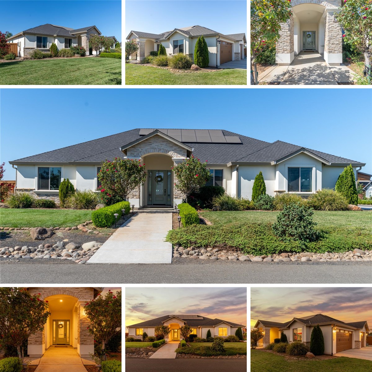 Located on the desirable North side of town, this beautiful newer-built home offers the perfect blend of peaceful living and convenience—just minutes from town, yet in a serene setting where the sunsets are absolutely breathtaking. Sitting on nearly an acre, the home’s interior is equally impressive, featuring high ceilings, crown molding, plantation shutters, gorgeous plank flooring, and abundant natural light. Off the entry, you’ll find a versatile formal dining room—perfect as an office or additional living space. The spacious living room showcases soaring ceilings, a cozy fireplace, and large windows framing picturesque backyard views. The kitchen is open to the living room, offering a peninsula with bar seating, granite countertops, custom dark wood cabinetry, subway tile backsplash, stainless steel appliances, a pantry, and a 6-burner gas cooktop. Just off the kitchen, the dining nook overlooks the sparkling pool with waterfall. This side of the home also includes the laundry room, a guest bedroom, a full bathroom, and a 3-car garage. On the opposite wing, you’ll find two additional guest bedrooms, another full bathroom, and the luxurious primary suite—complete with a spa-like ensuite featuring a walk-in shower, jetted soaking tub, and a large walk-in closet. Additional upgrades include owned solar and a whole house fan. The backyard is nothing short of spectacular—an entertainer’s dream! Enjoy a saltwater pebble tec pool, multiple lounge areas, a mini golf course, bocce ball court, pickleball court, sand volleyball court, basketball court, and a grass area complete with a 70x100 football field and goal posts—all set within beautifully landscaped grounds. This home truly has it all—style, space, and unmatched amenities—making it the perfect place to relax, entertain, and enjoy life to the fullest.